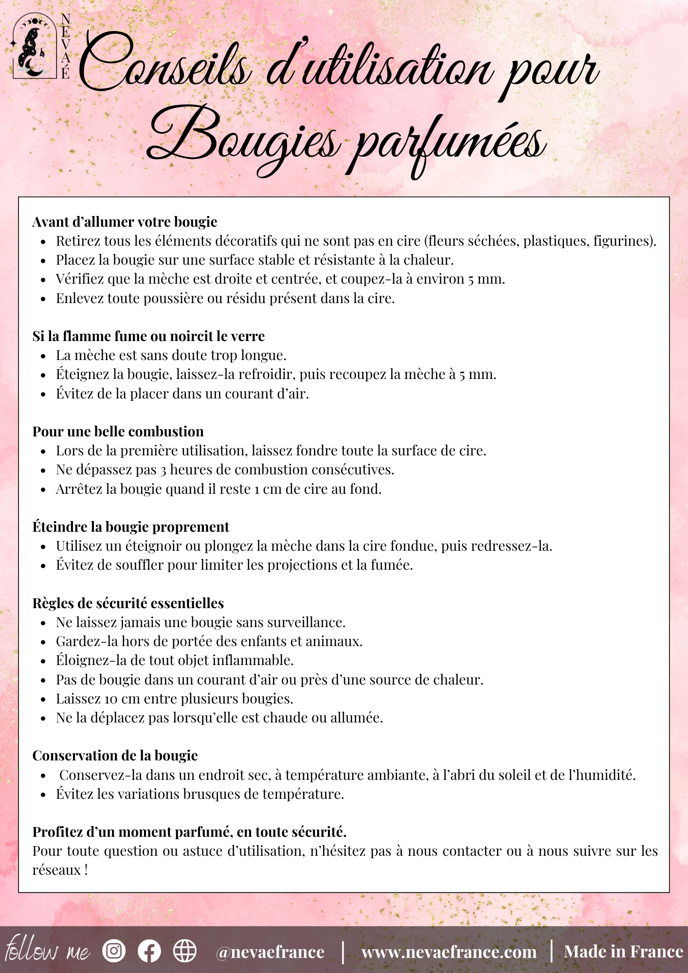 Ne jamais laisser une bougie allumée sans surveillance. Ne dépassez pas 3 heures d'allumage consécutives. Tenir hors de portée des enfants et des animaux.
