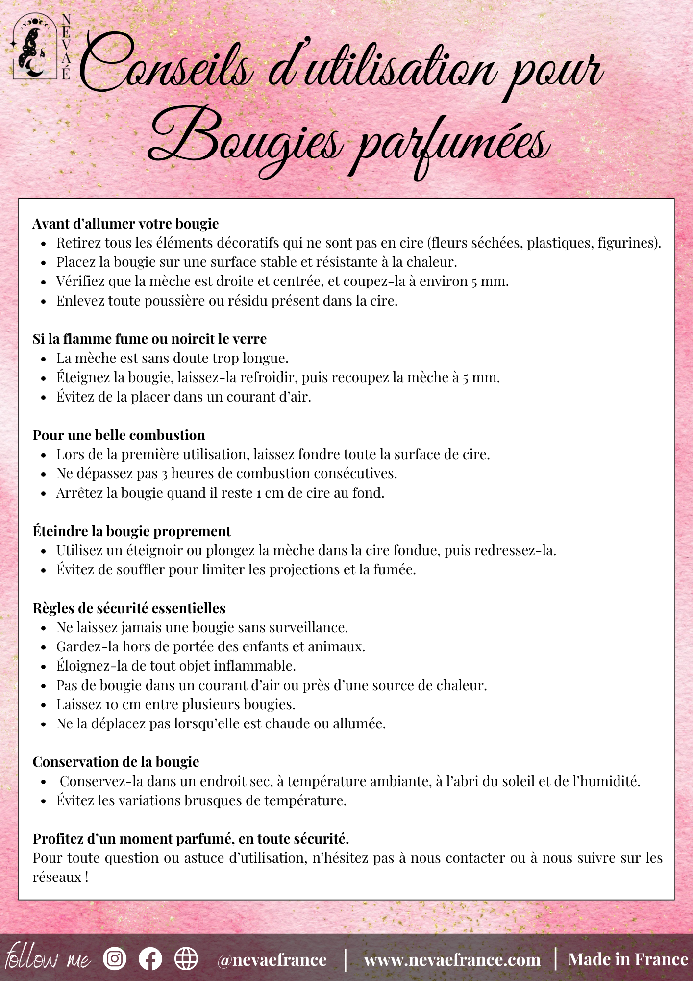 Ne jamais laisser une bougie allumée sans surveillance. Ne dépassez pas 3 heures d'allumage consécutives. Tenir hors de portée des enfants et des animaux.