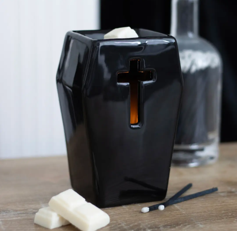 Ce brûleur à cire et à huile parfumée en forme de cercueil est un véritable coup de cœur pour les amateurs de style gothique et de décoration atypique. Lorsqu’une bougie chauffe-plat est placée à l’intérieur, le motif en forme de croix s’illumine, projetant une lumière douce et des ombres mystérieuses dans la pièce.