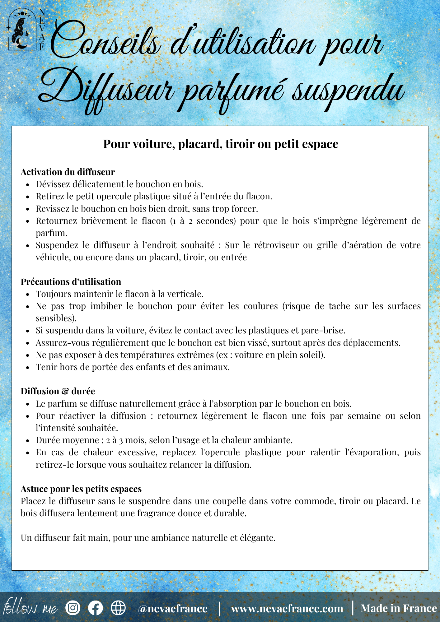 Ce diffuseur est idéal pour parfumer délicatement votre voiture, placard, tiroir ou tout petit espace. Pour l’activer, il suffit de dévisser doucement le bouchon en bois, de retirer l’opercule plastique, puis de revisser le bouchon bien droit. Retournez brièvement le flacon (1 à 2 secondes) afin que le bois s’imprègne légèrement de parfum, puis suspendez-le à l’endroit souhaité : rétroviseur, grille d’aération, poignée de placard ou simple tiroir.