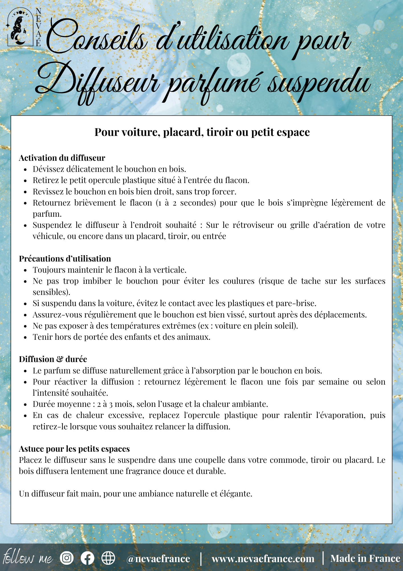 Ce diffuseur est idéal pour parfumer délicatement votre voiture, placard, tiroir ou tout petit espace. Pour l’activer, il suffit de dévisser doucement le bouchon en bois, de retirer l’opercule plastique, puis de revisser le bouchon bien droit. Retournez brièvement le flacon (1 à 2 secondes) afin que le bois s’imprègne légèrement de parfum, puis suspendez-le à l’endroit souhaité : rétroviseur, grille d’aération, poignée de placard ou simple tiroir.