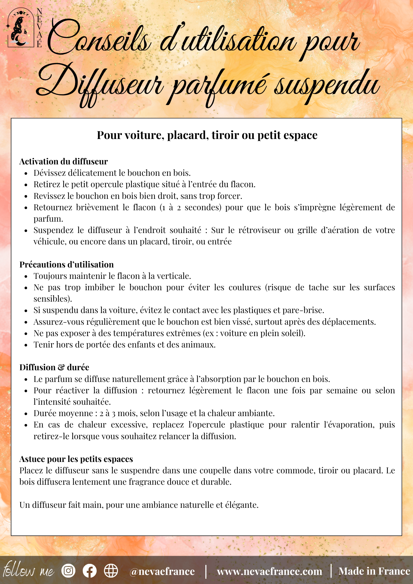 Ce diffuseur est idéal pour parfumer délicatement votre voiture, placard, tiroir ou tout petit espace. Pour l’activer, il suffit de dévisser doucement le bouchon en bois, de retirer l’opercule plastique, puis de revisser le bouchon bien droit. Retournez brièvement le flacon (1 à 2 secondes) afin que le bois s’imprègne légèrement de parfum, puis suspendez-le à l’endroit souhaité : rétroviseur, grille d’aération, poignée de placard ou simple tiroir.