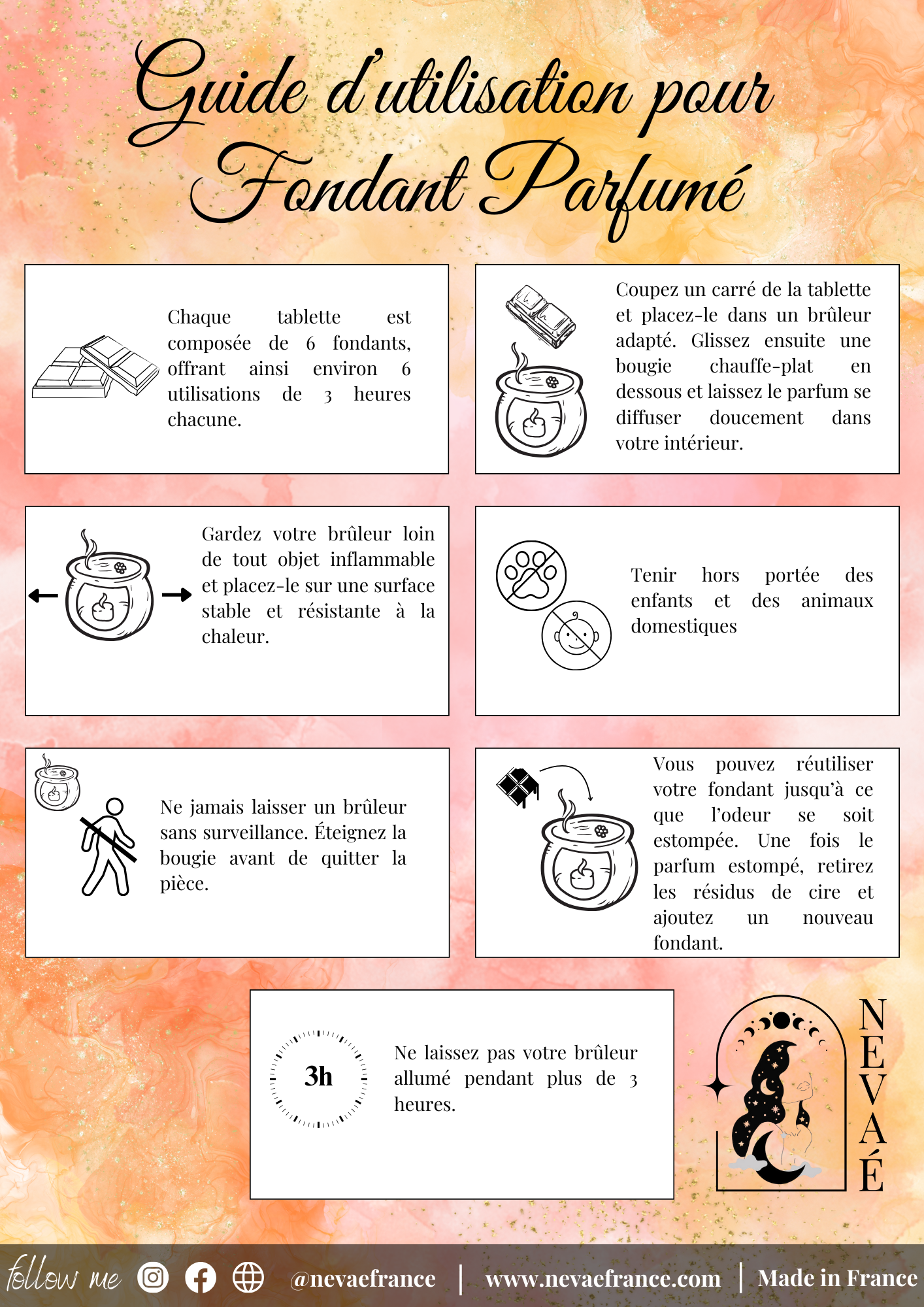 Les fondants parfumés sont cruelty-free (non testés sur les animaux), composés de cire végétale et de parfums fabriqués à Grasse, en Provence, par des maîtres parfumeurs. Nos fragrances sont garanties sans substances cancérigènes, mutagènes ou reprotoxiques, pour une diffusion en toute sérénité.